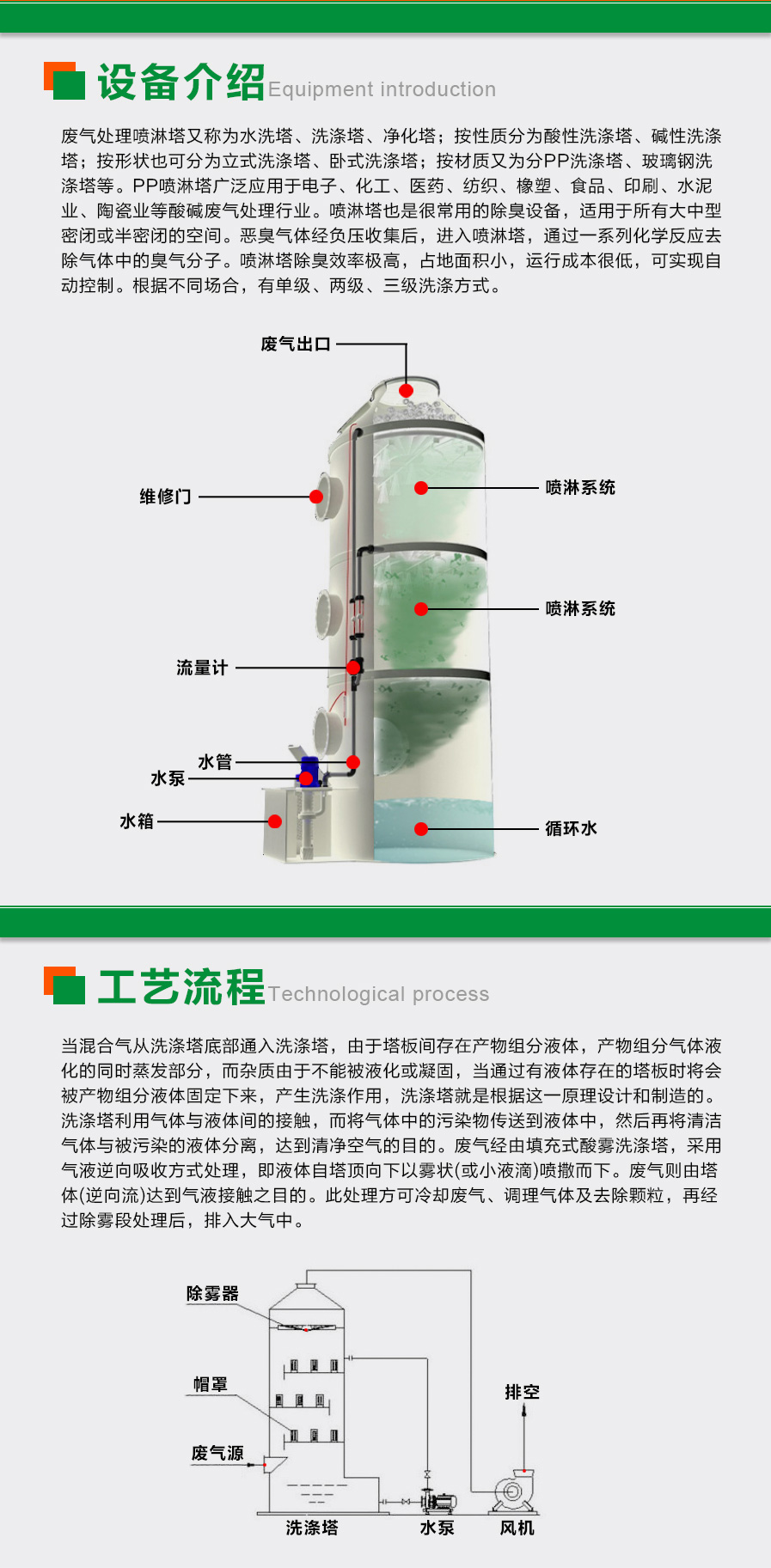 簡(jiǎn)介:  噴淋塔(俗稱:水淋塔)是一種處理煙塵廢氣的濕式環(huán)保設(shè)備,可適用于發(fā)電廠燃燒煙塵、鋼鐵廠、鍋爐燃燒、垃圾燃燒等煙塵廢氣處理,這類的煙氣粉塵容易溶于水,噴淋塔是處理這類煙氣粉塵的不二之選。煙氣粉塵從塔底進(jìn)入塔內(nèi),塔內(nèi)有填料支撐板,噴淋塔從塔頂噴出液體,液體均勻的分布在塔內(nèi)和污染物充分接觸,達(dá)到凈化的效果,最后塔頂排出。