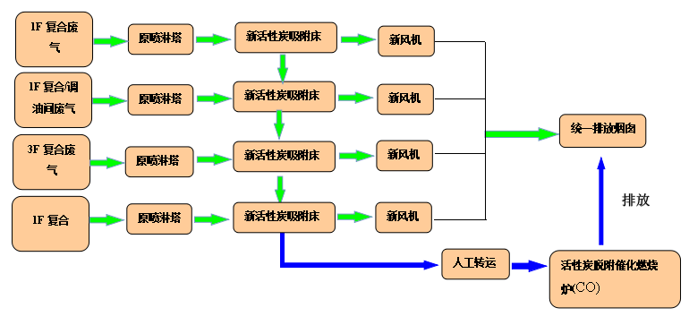 目前該公司在各車(chē)間根據(jù)不同的生產(chǎn)工藝分類(lèi)收集廢氣匯入主風(fēng)管,主風(fēng)管接入指定廠(chǎng)房排風(fēng)井,經(jīng)風(fēng)井在離心風(fēng)機(jī)的牽引作用下引入屋面廢氣治理設(shè)施,對(duì)于低濃度廢氣采用的是水噴淋吸收法,對(duì)于高濃度廢氣采用的是水噴淋吸收+活性炭吸附法,該公司為響應(yīng)環(huán)保要求,擬對(duì)廢氣處理設(shè)施提標(biāo)改造。