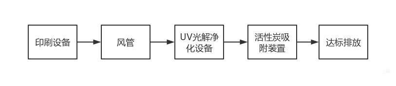 生產(chǎn)過程中產(chǎn)生的印刷廢氣通過風機的作用下進入風管,首先廢氣會進入UV光解凈化設備,然后印刷廢氣會進入活性炭吸附裝置,最后達標排放。