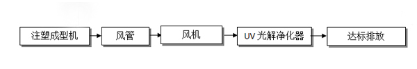 該公司在生產(chǎn)過程中有注塑成型工序,該工序產(chǎn)生了一定量非甲烷總烴有機廢氣。根據(jù)廠房提供的資料,我們工程師在參考了廣東省地方標準《大氣污染物排放標準》(DB44/27-2001),中華人民共和國《大氣污染物綜合排放標準》(GB16297-1996)后,根據(jù)以往工程經(jīng)驗,為該企業(yè)選擇了UV光解為主體處理工藝。